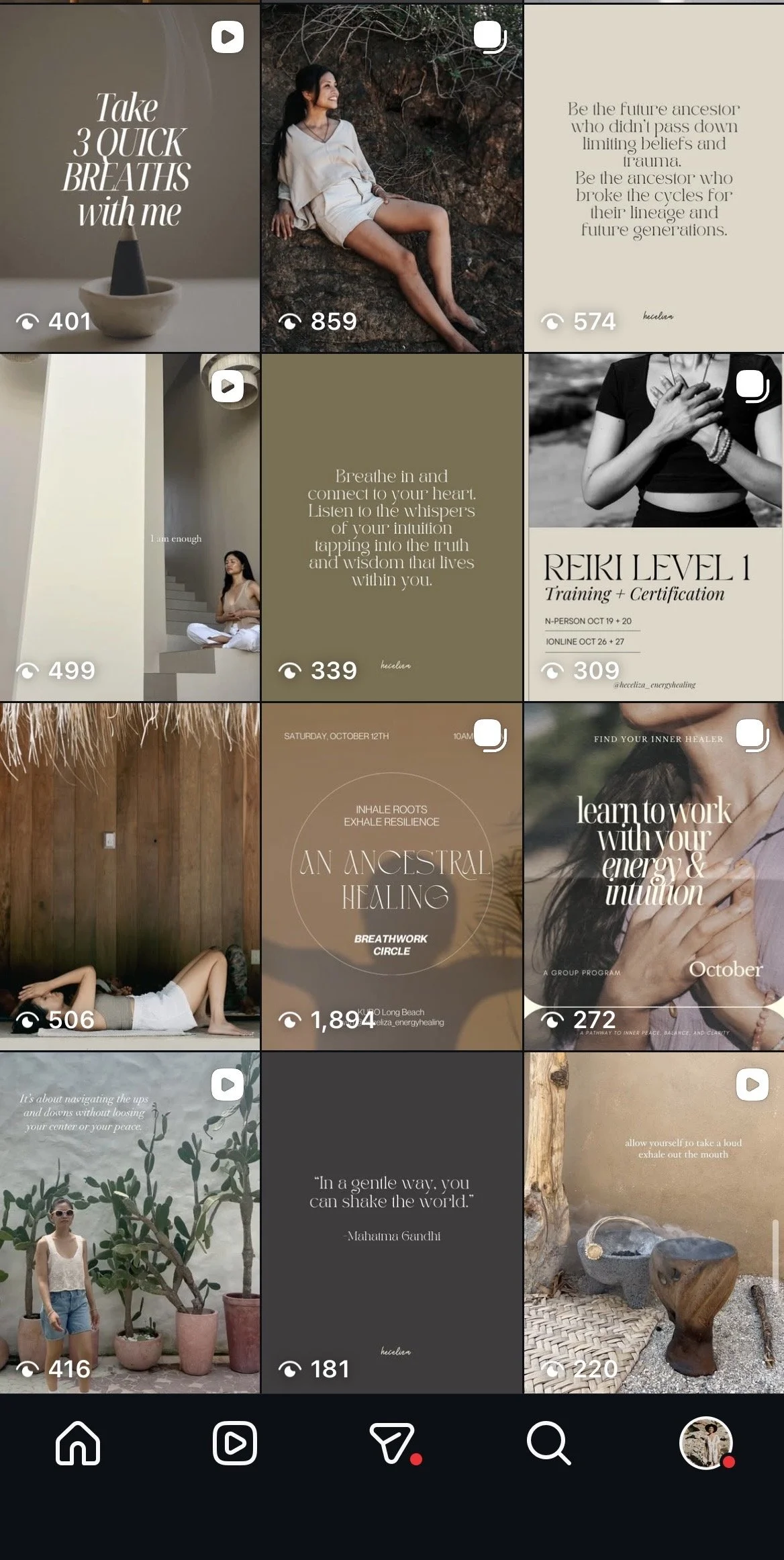 From presenting a polished, distant expert persona, I pivoted my brand around accessibility and lifestyle integration while maintaining aesthetically appealing brand consistency. I show my actual life — traveling between California, Asia, and Costa Rica — while weaving in education on energy work and intuition. The content targets female founders and organizational leaders, speaking to women who want both success and alignment.