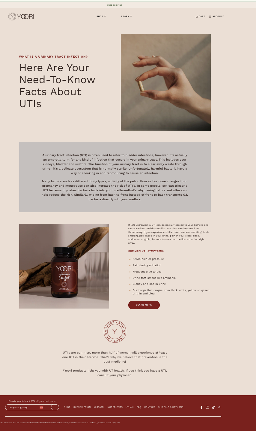 Collaborated directly with Urologist on formula development while simultaneously building market-ready brand. Coordinated lab partnerships for production, packaging in accordance to FTC guidelines, developed brand identity that balanced credibility with approachability, and created community-first go-to-market strategy — integrating Yoori into wellness events and conversations rather than relying solely on digital advertising.